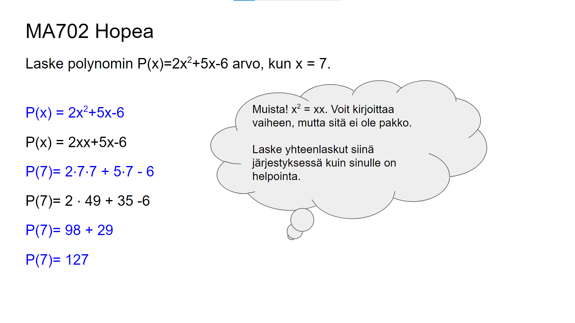 H5. Laske polynomin \(P(x)=4x^2-9x+7\) arvo, kun